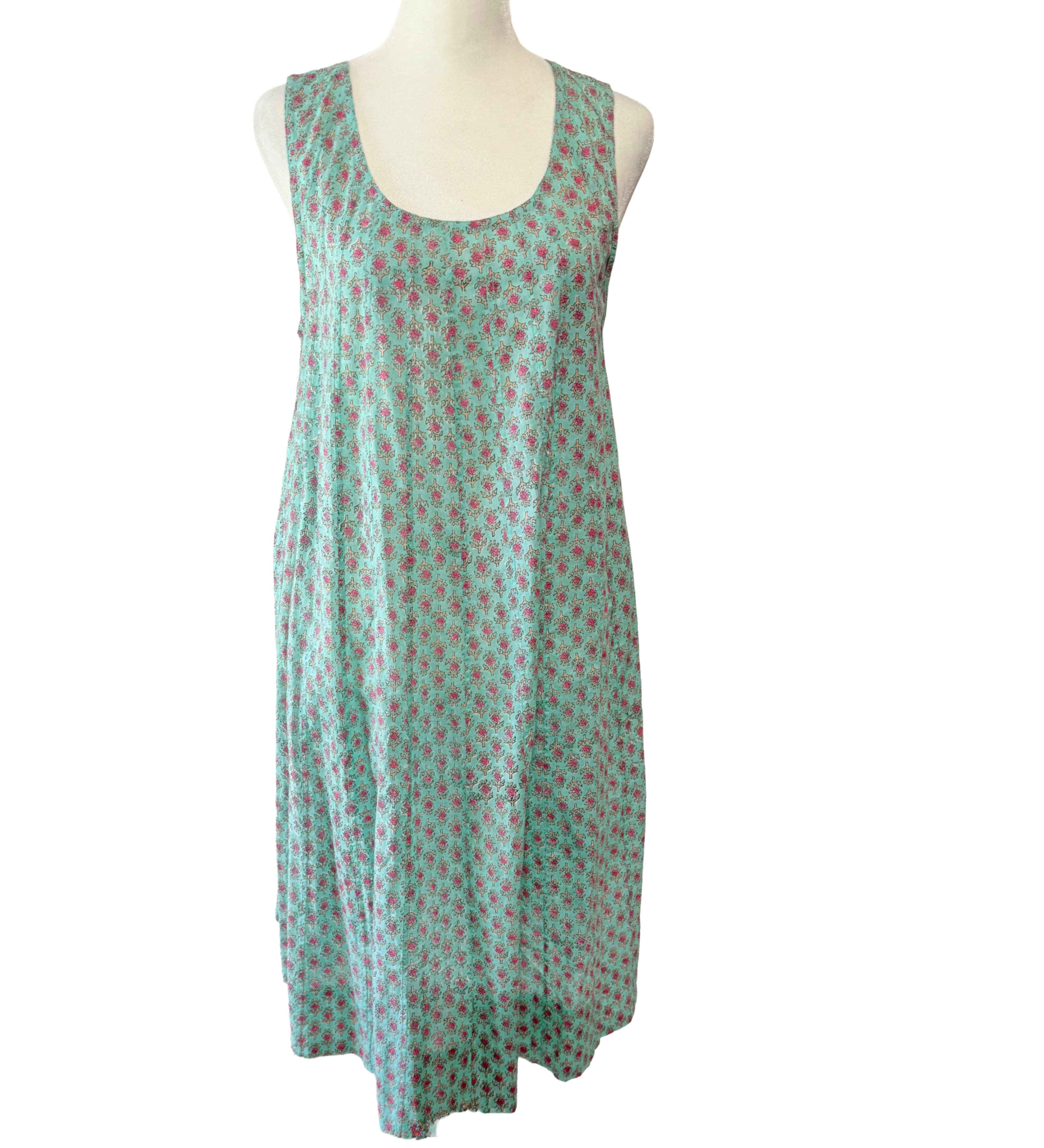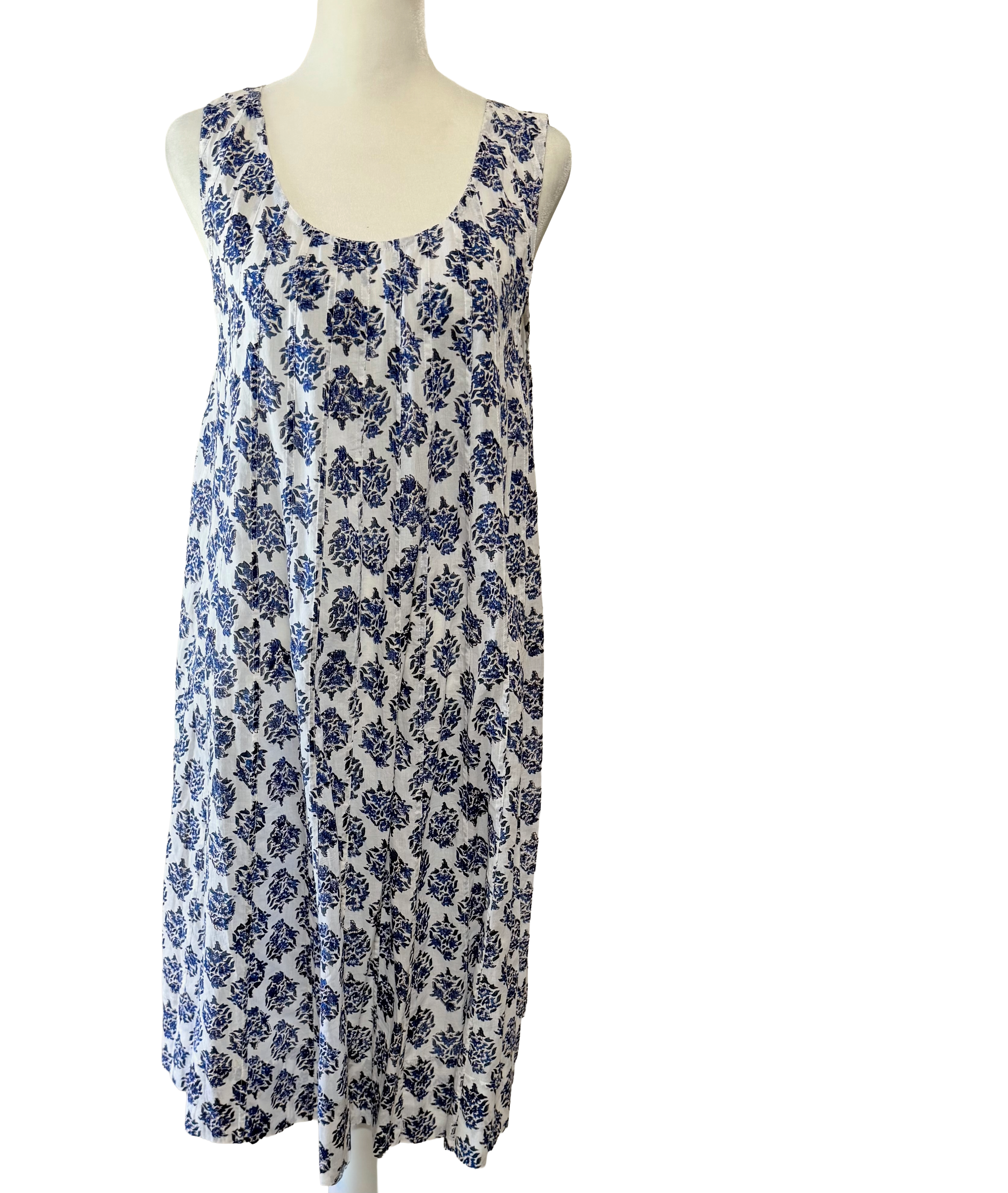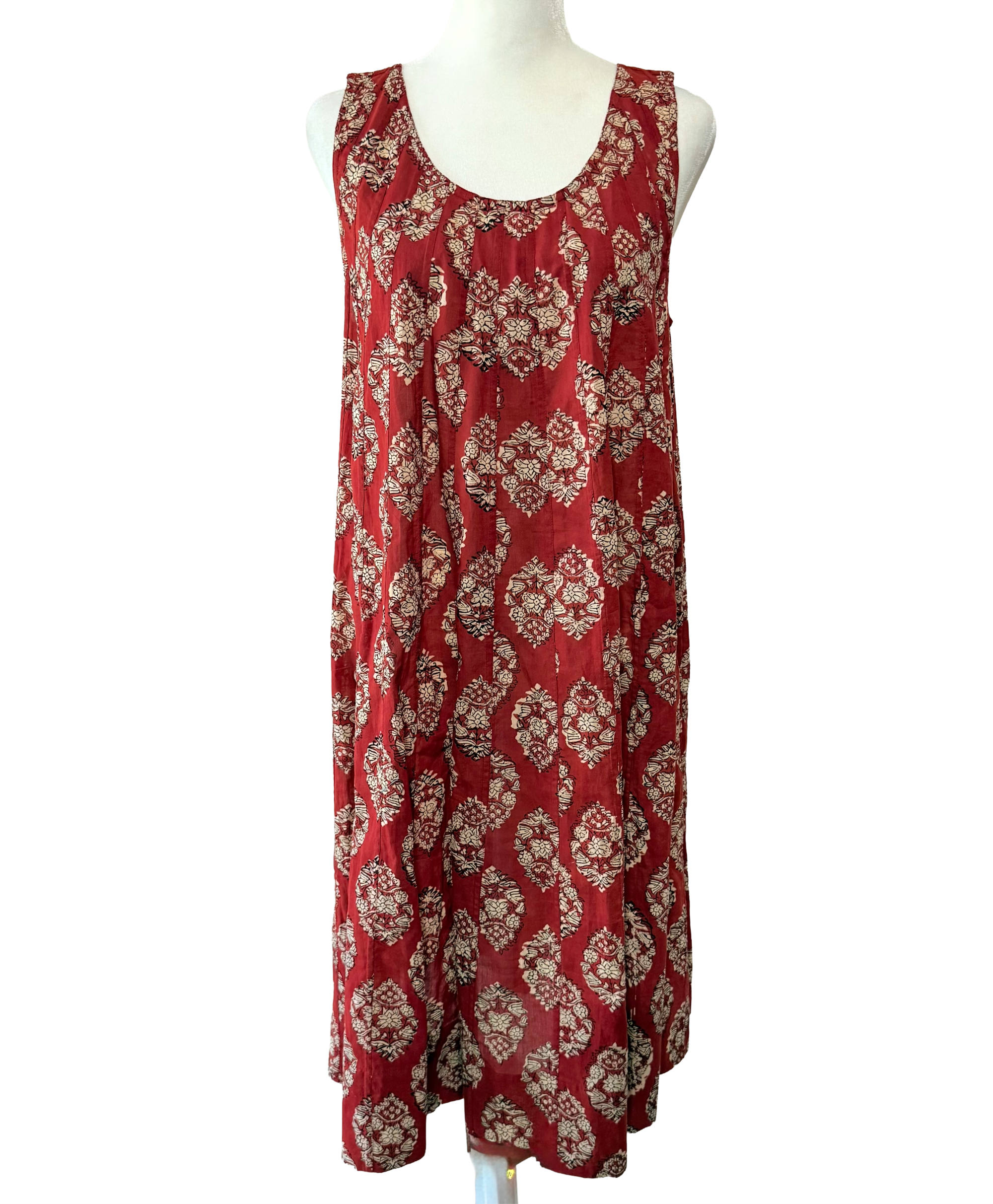 Crafted from soft, breathable cotton, this artisanal hand block-printed dress features a relaxed flared silhouette for effortless comfort. The single-piece design, made of pleated panels, allows easy movement, while the sleeveless cut and gentle neckline keep the look simple and versatile for warm days.