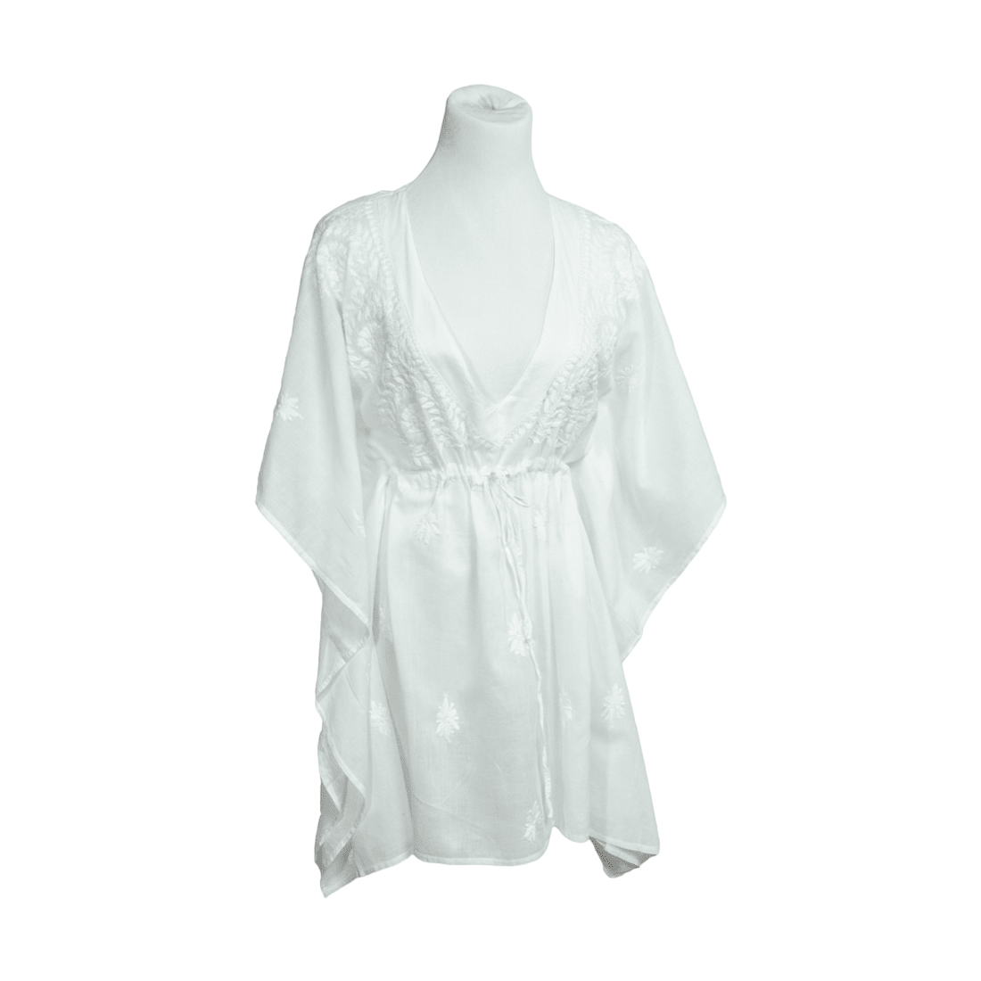 Soft, comfortable Kaftan Top in superior cotton with fine hand embroidery. Our signature Kaftan Top is flared with a V-Neckline, and all over hand embroidery in the front and back. The Drawstring gives flexibility in fitting. Feel enveloped in softness wearing this flared top. Great for use as a beach cover-up.