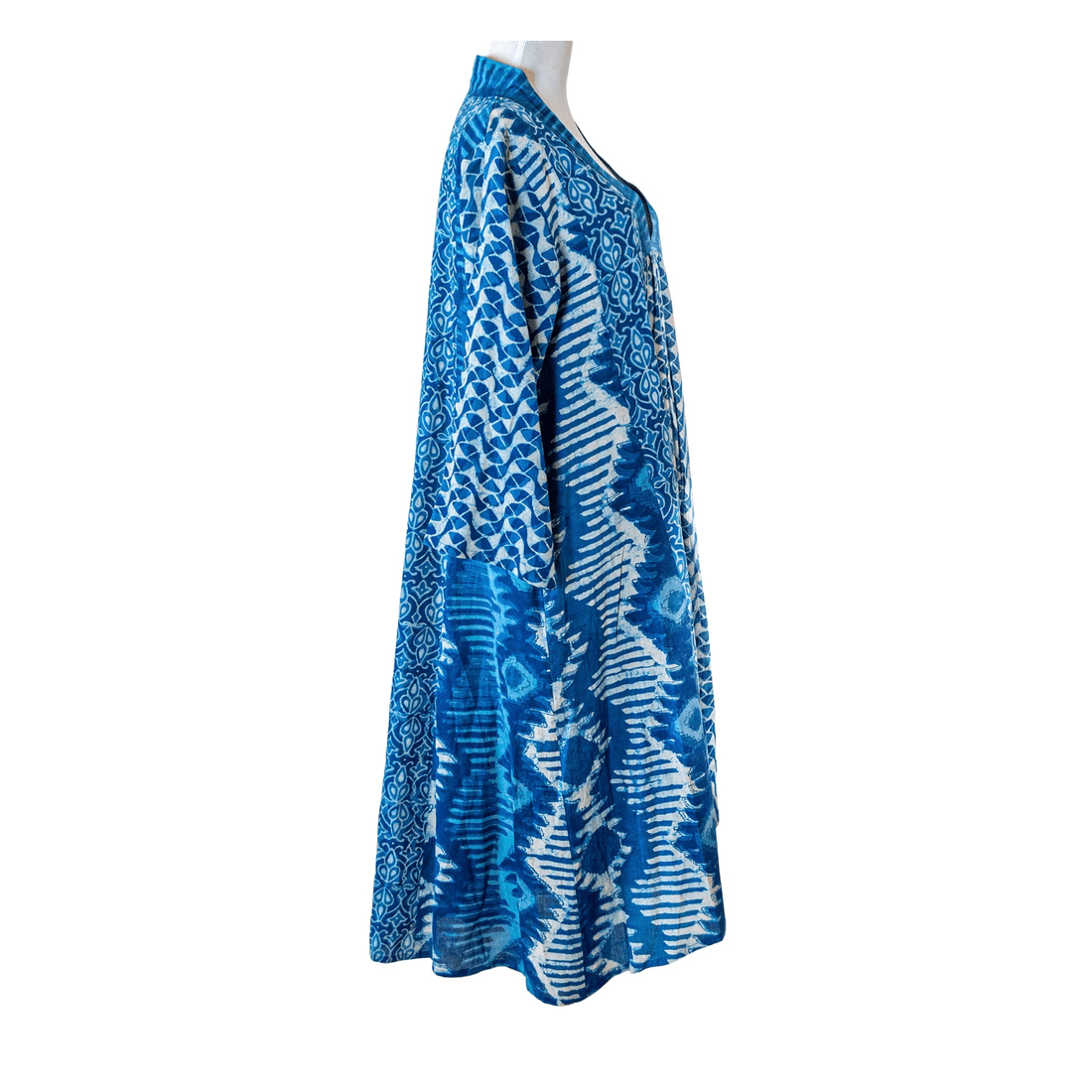 Mid-calf cotton dress with indigo block prints, a V-neck with flat collar, and a slight high-low hem. Concealed pockets add practical charm, while the artisanal prints, thoughtfully combined into a harmonious pattern, complete the breezy, summery look.
