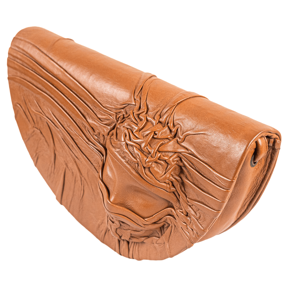 Genuine leather purse with covered face embellishment. This arty half-moon shape leather Shoulder Bag has a uniquely handcrafted woman's face on the front. Fold-over flap with magnetic closure and inner wall pocket with zipper.