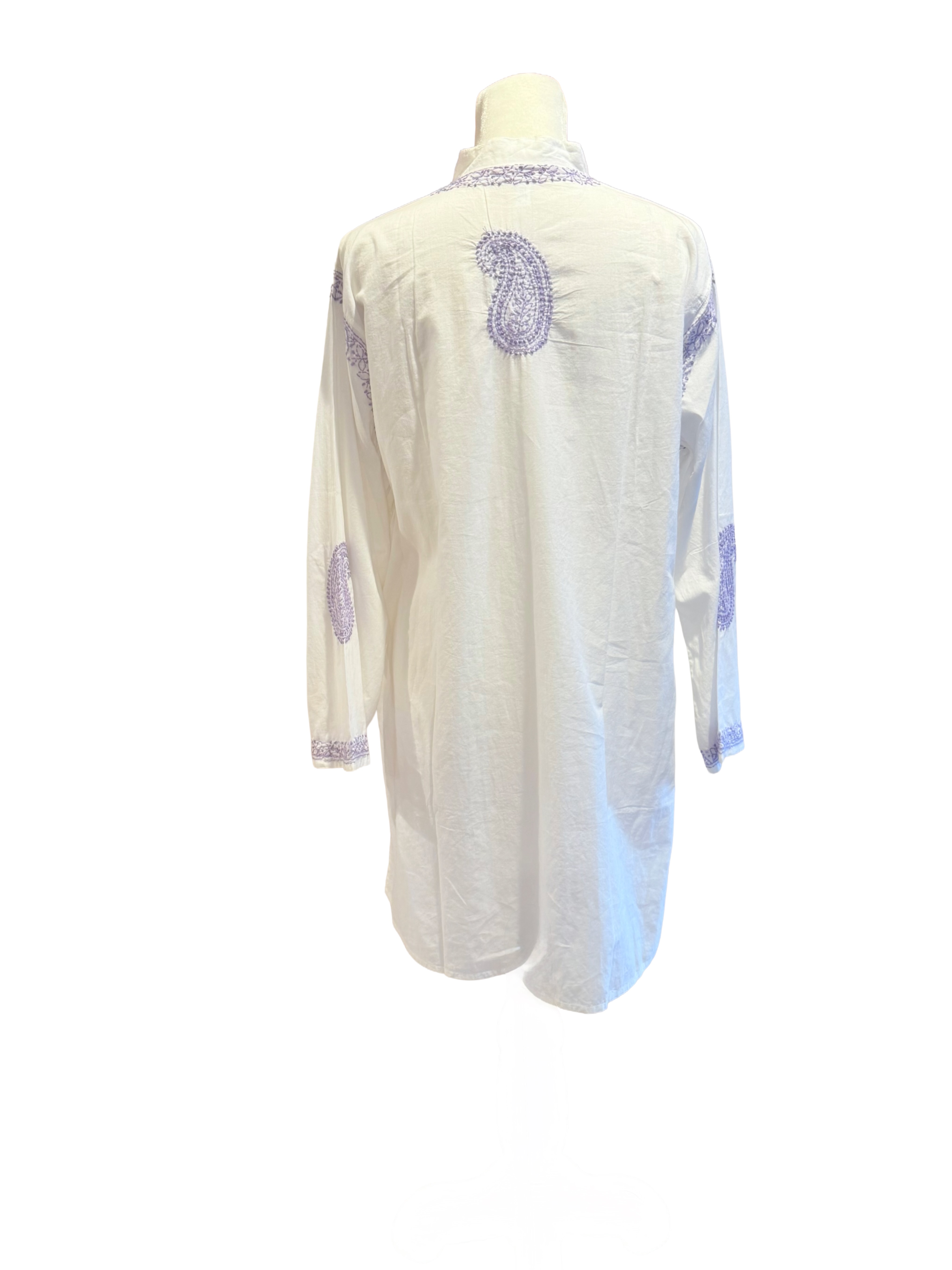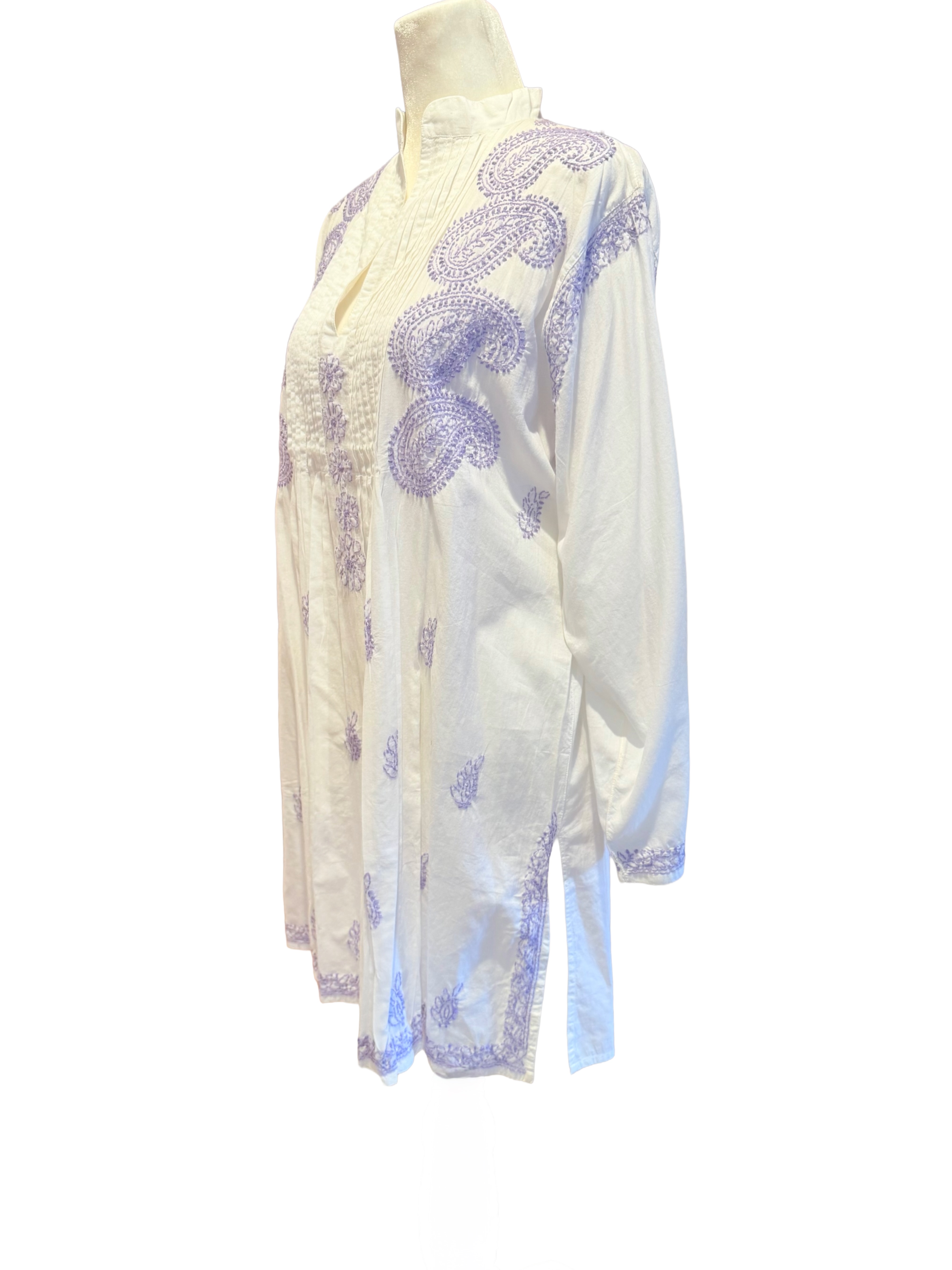 Evergreen style in comfortwear! Superior quality cotton Tunic with front pleats and embroidery motifs. High collar tunic having full sleeves and side slits. The top is of highly durable thick cotton that would not require any slip inside. Back is accented with a matching embroidered motif. Wear it over leggings, or jeans.