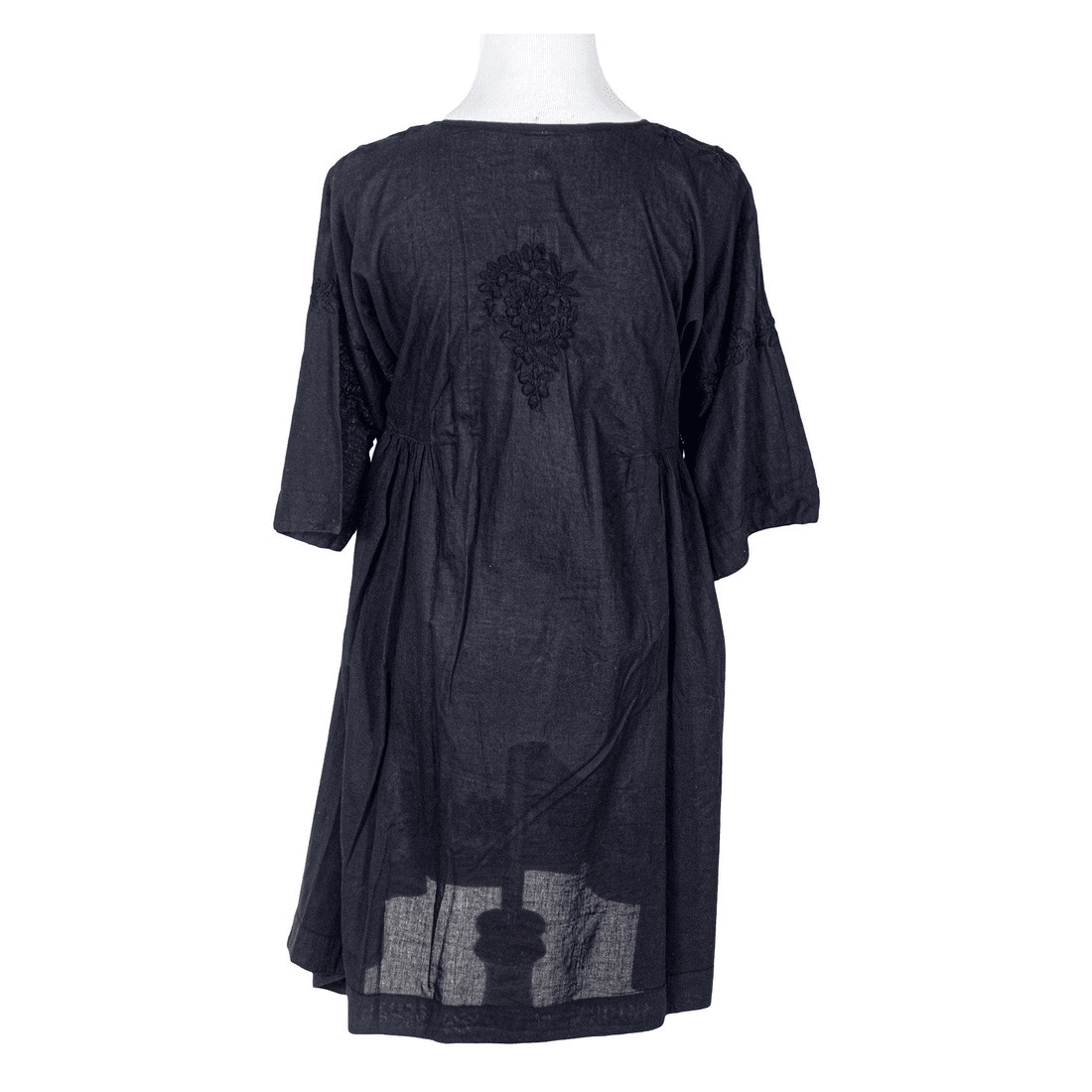 Our bestseller! Soft feel, airy, superior cotton with exceptional hand embroidery in the front, dress. it has a slight plunged V- Neckline and raglan sleeves that end just over the elbow. Side gathers give it a roomy flare. Wear it as a top or a dress to impress.
