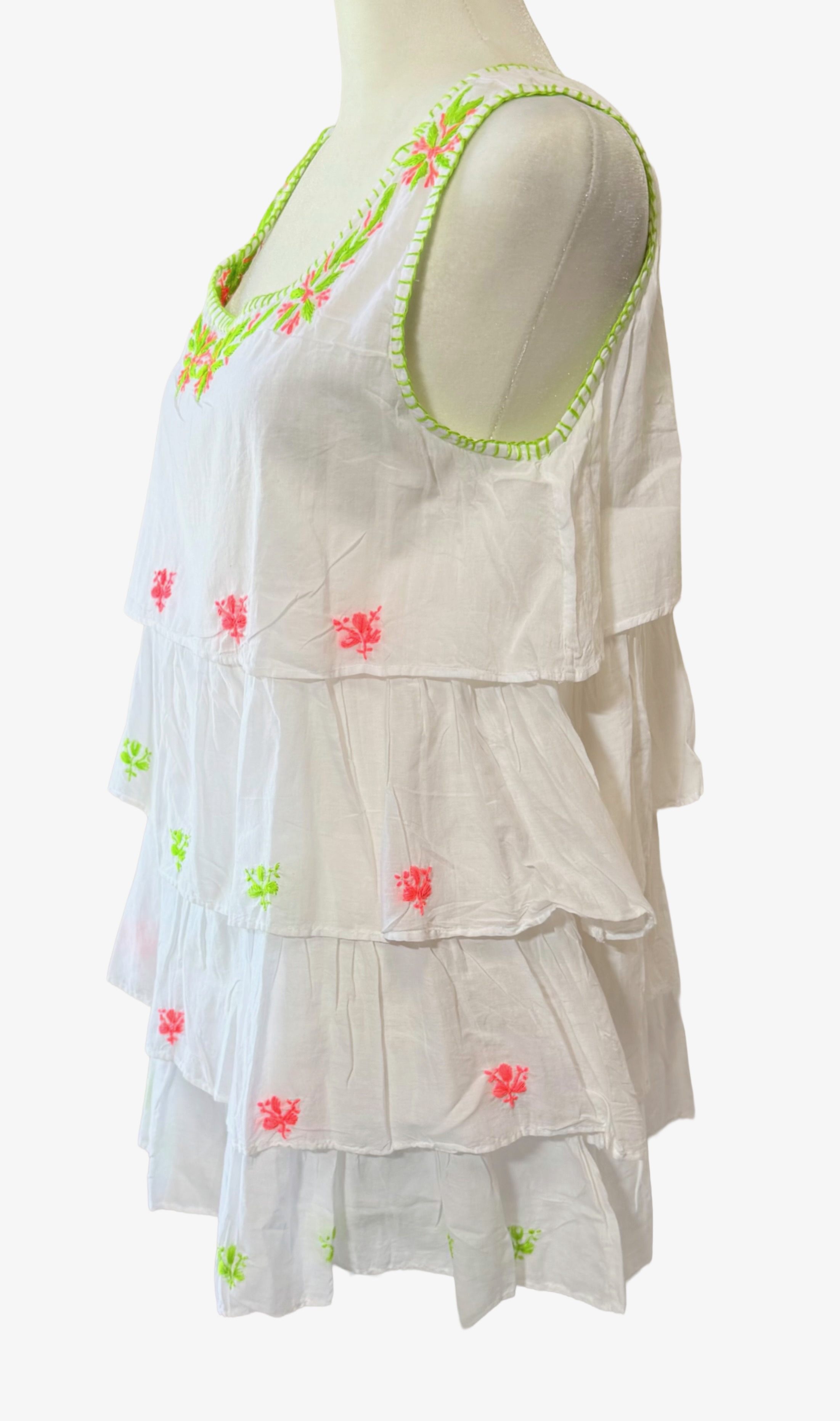 Light, airy, in breathable superior cotton, soft feeling with hand embroidery. Tiered in three layers of embroidered long ruffles with blanket stitch edging makes it a fun top to wear for all ages.