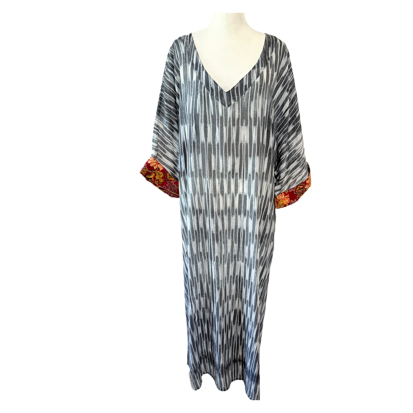 A full-length kaftan in hand block Shibori print accented with a contrast color print border on the sleeves. The front neckline is a deep V with a drawstring waistline to adjust the shape for all body types. This is a breezy cotton kaftan with side pockets! A kaftan for beach, resort, vacation, cruise, pool, home parties, and or lounge this kaftan is a step higher from casual wear to upper casual wear.