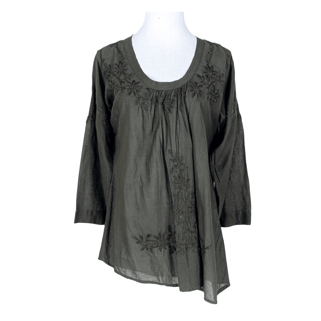 Soft, airy, and comfortable in superior cotton with hand embroidery. This is our most sophisticated style. Classy running embroidery on the oval neckline, with front embroidered pleats. It goes very well over dressy pants or jeans.