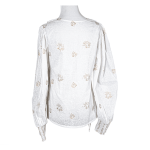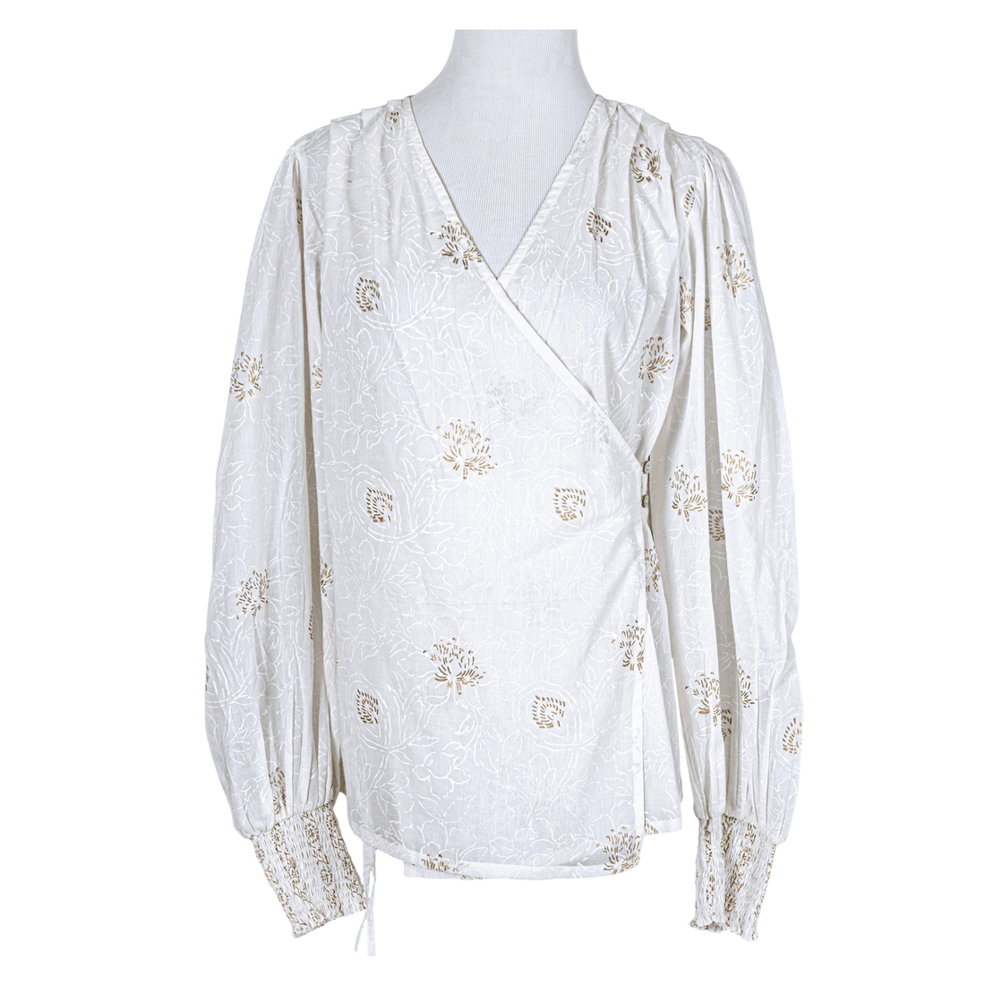 Angarkha style top in lightweight, breathable self-print cotton with small gold block printed motifts. The inner flap has a drawstring while the outer flap has two accent buttons. Full sleeves with broad 4"" smocked elastic cuffs. Pleats from shoulder make it roomy and comfortable for all body types. This top would surely be good over skinny jeans or regular pants for that dressy look.