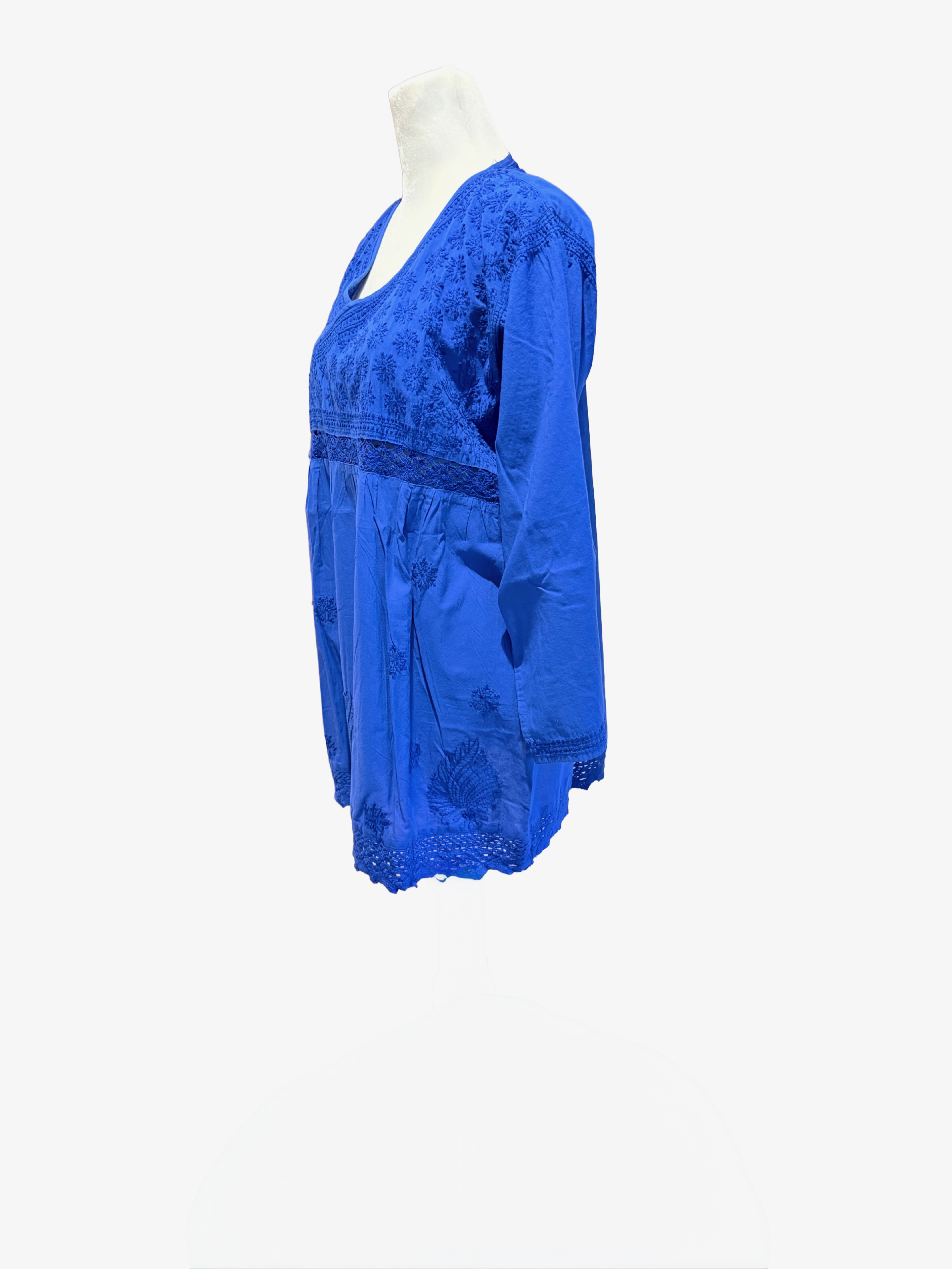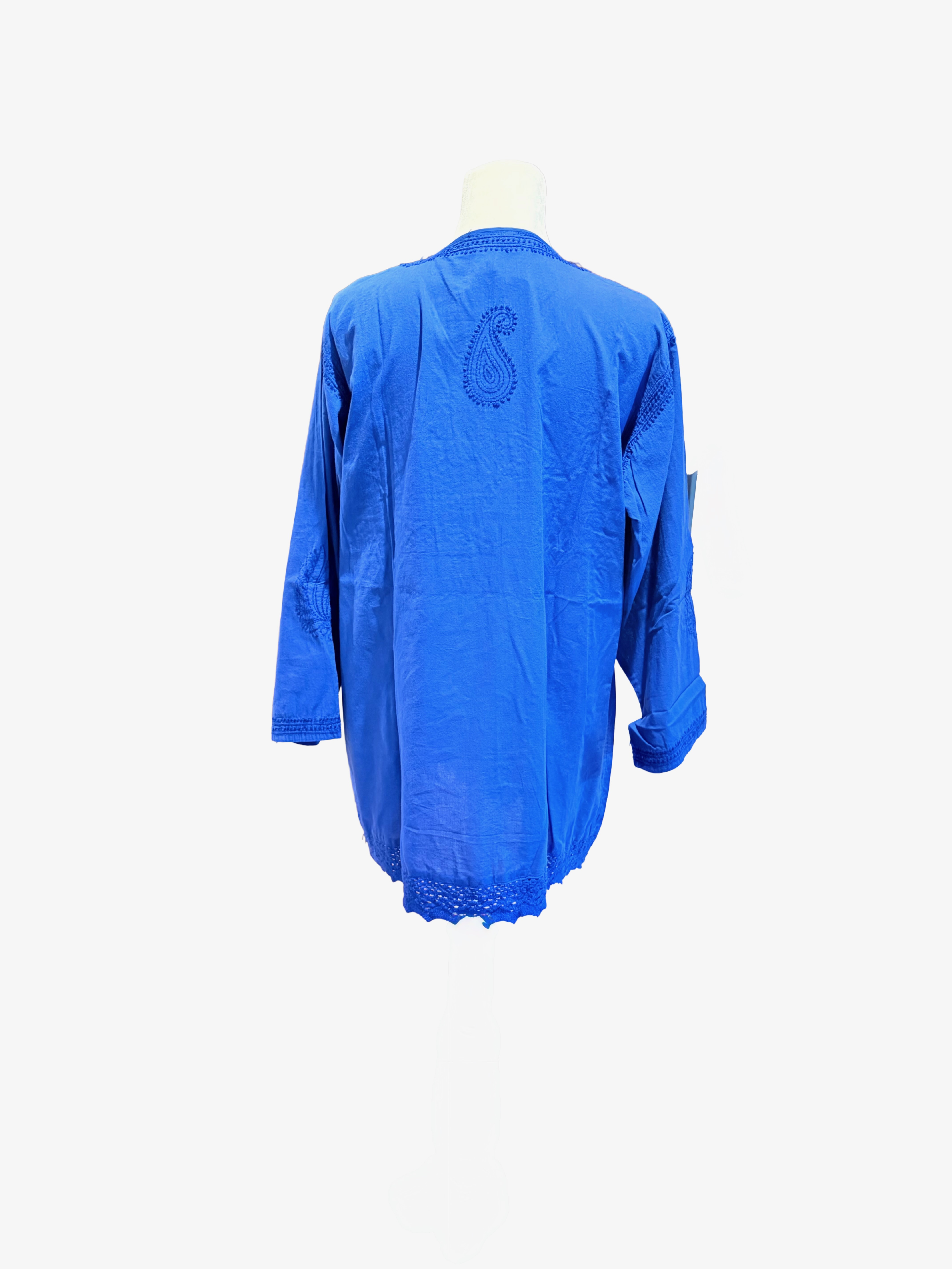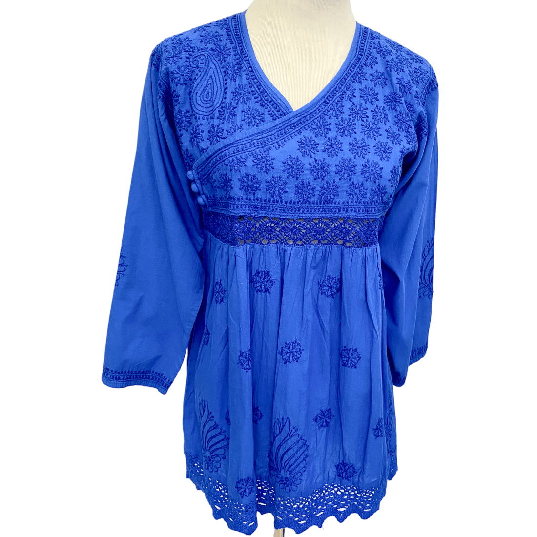 This beautifully designed top with exceptional hand embroidery truly stands out. Made of superior cotton with hand-crocheted lace on the waist and hem. Long ¾ sleeves accented with embroidery. Back is accented with an embroidered motif for a fully authentic look. Perfect choice for a petite body. Last few pieces in stock, so hurry.