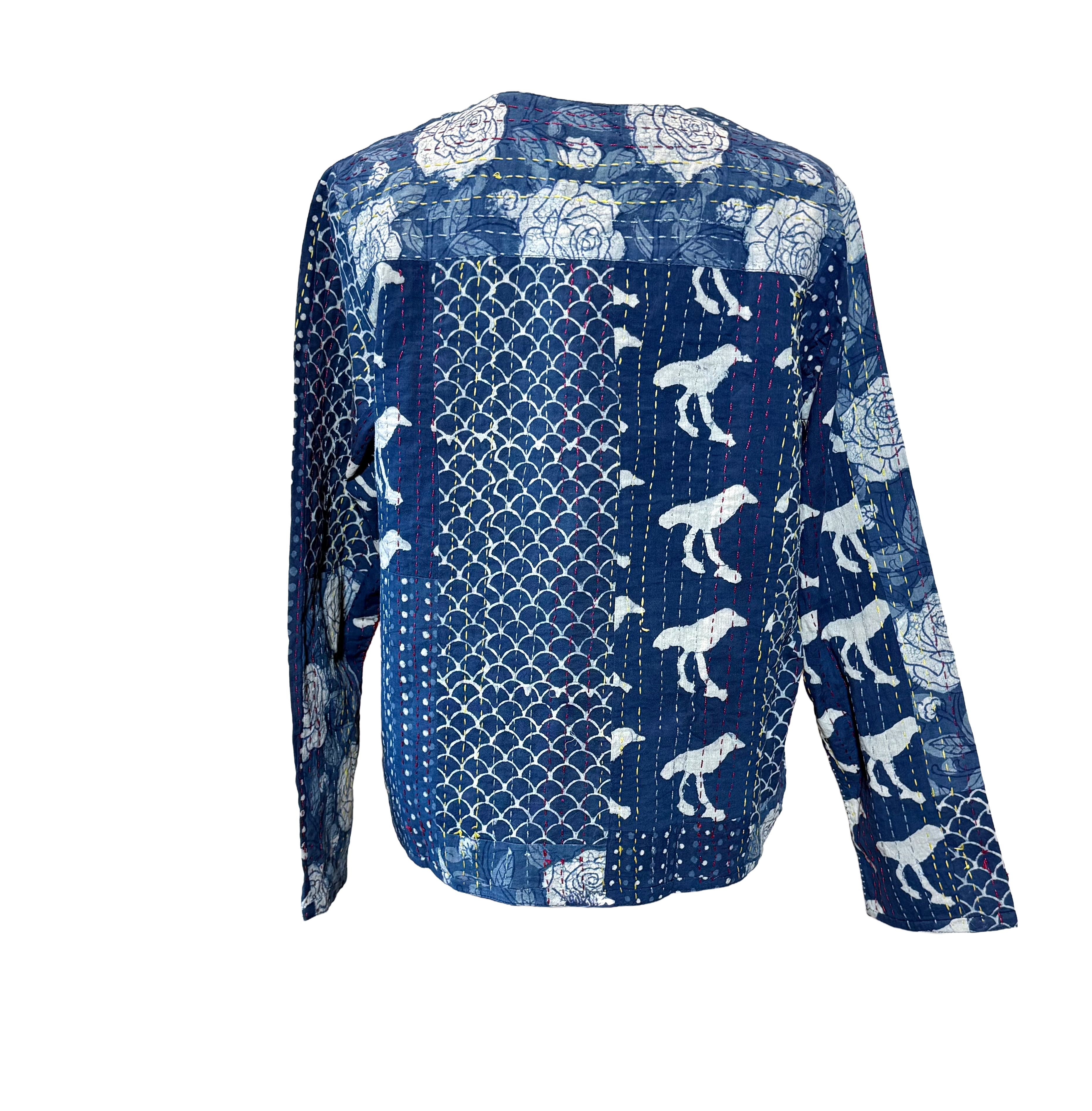 Bring artisanal charm to your collection with these unique indigo jackets, crafted in soft cotton and detailed with traditional block prints. Each piece is enhanced with fine kantha hand-stitching, adding texture, depth, and a one-of-a-kind character.