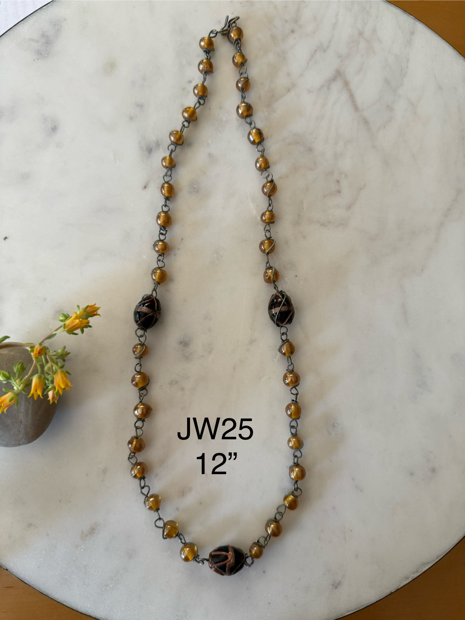 Hand-strung with care, each necklace measures approximately 8” in length and features a thoughtfully arranged pattern that feels striking on its own yet easy to layer with other favorites. Perfect for those who love artful, one-of-a-kind jewelry that brings color, character, and handcrafted beauty to everyday wear.