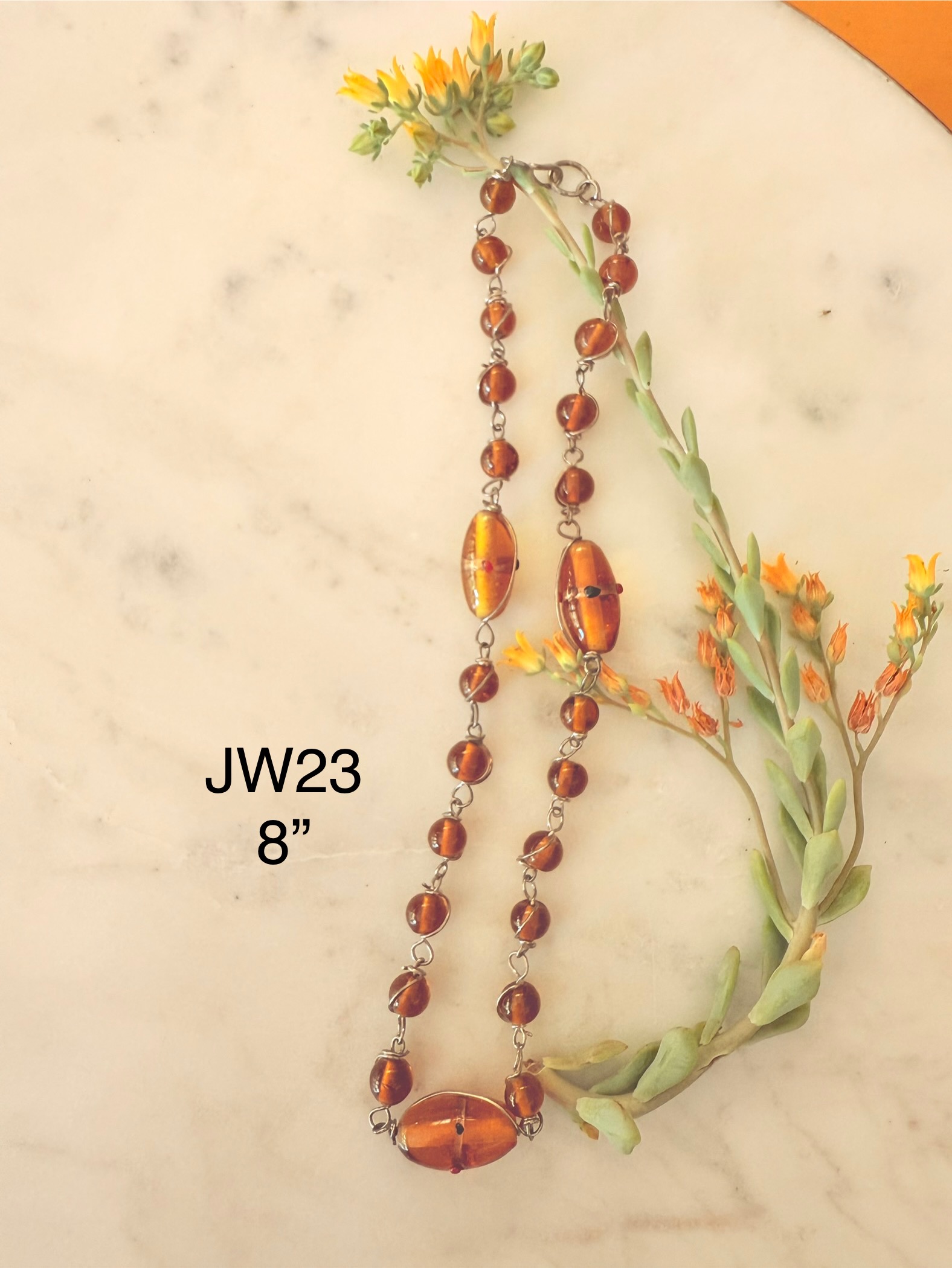 A vibrant glass-beaded necklace designed to add a pop of color and charm to any outfit. Featuring a playful mix of bead shapes—oval, round, faceted, and abstract—this piece showcases rich earthy tones accented with hues of Orange.