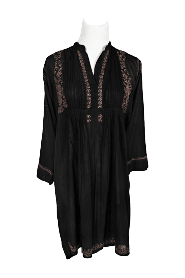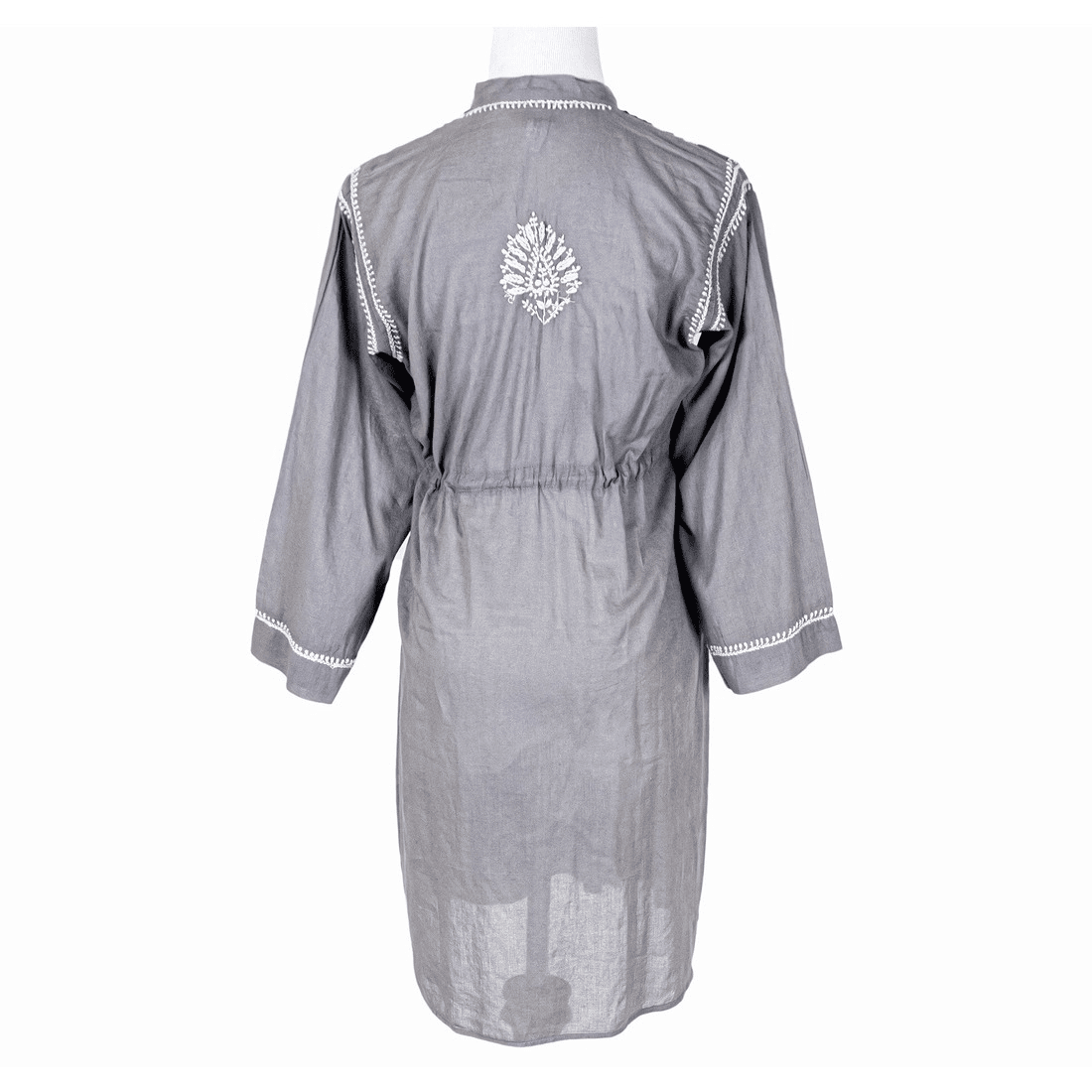 Light, airy hand-embroidered Tunic Top in superior soft-feel cotton. High collar, ¾ sleeves with folded endings, it comes with a drawstring. Tie it to enhance the couture or leave it untied for a more casual roomy top look. Back is accented with a matching embroidered motif. Wear it over leggings or skinny jeans to get that smart look.