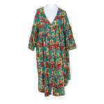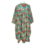 Effortless elegance meets artisanal charm in this loose-fitting, roomy dress that flattens all body types, including curvier figures. Crafted from soft cotton with a timeless block print, it features a V-neckline with a buttoned front for a subtle vintage touch. Twisted pintuck detailing adorns the bodice and sleeves, while ¾-length flared sleeves and hidden pockets complete the relaxed, feminine silhouette.