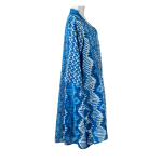Mid-calf cotton dress with indigo block prints, a V-neck with flat collar, and a slight high-low hem. Concealed pockets add practical charm, while the artisanal prints, thoughtfully combined into a harmonious pattern, complete the breezy, summery look.