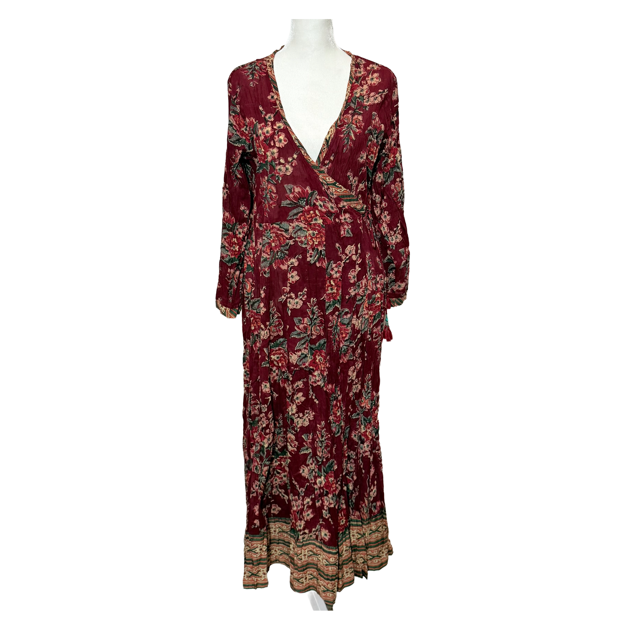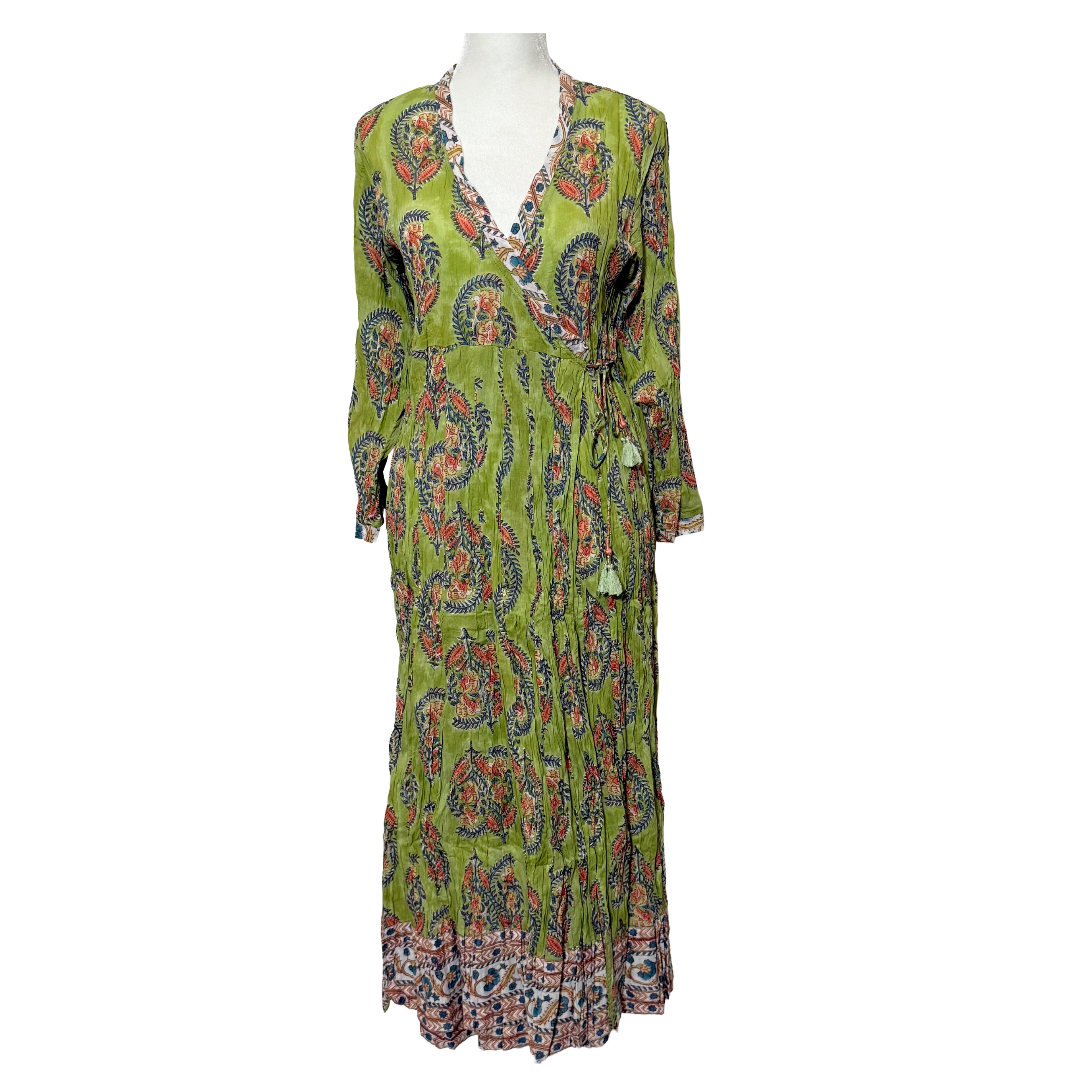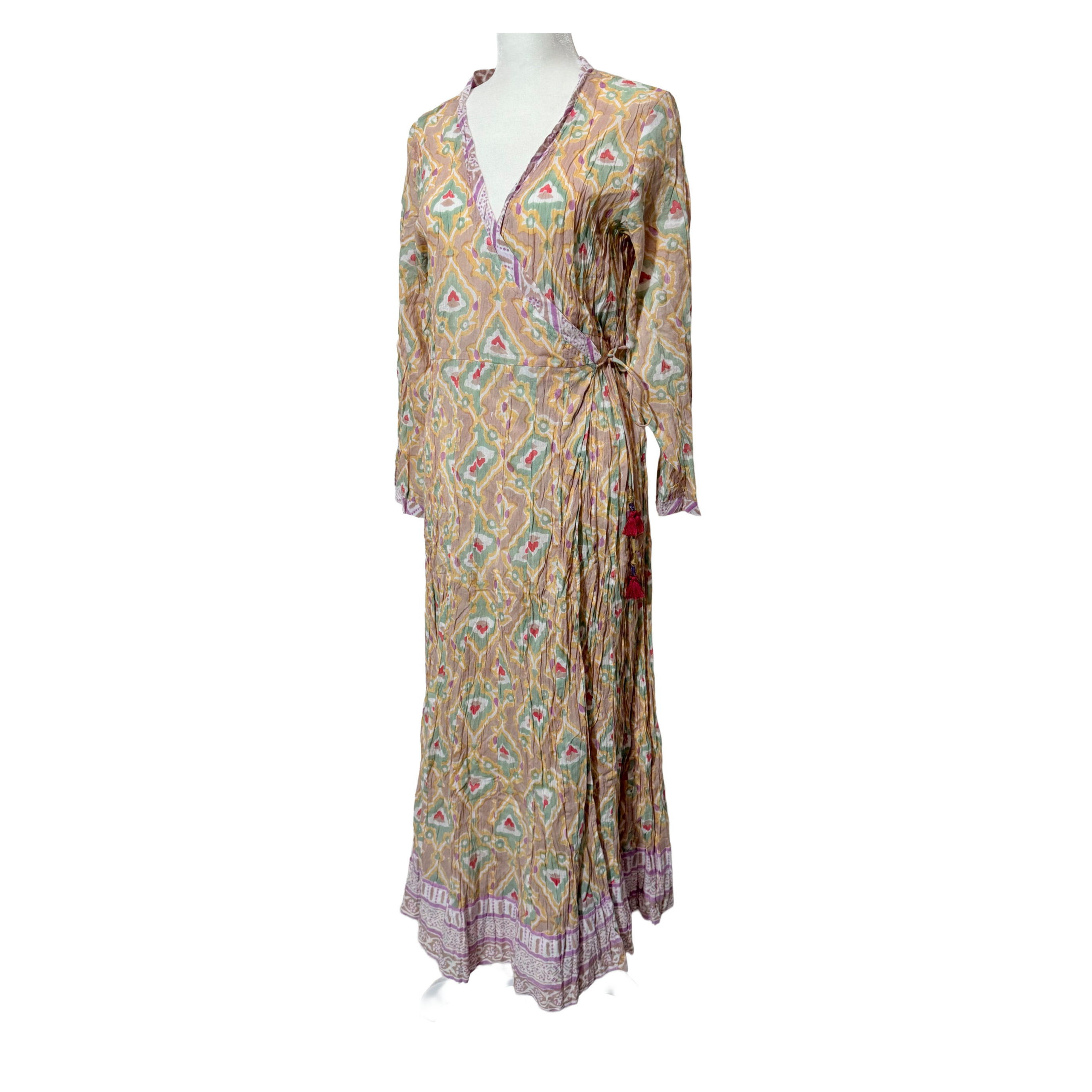 Embrace effortless artistry in this flowing handcrafted cotton wrap dress, where every fold reflects the charm of traditional Indian block printing. The lightweight fabric drapes gracefully, flattering every shape with its adjustable wrap Angarkhan style silhouette and soft, crinkled texture. Perfect for slow mornings, sun-drenched getaways, or breezy evenings, it’s as free-spirited as it is timeless.