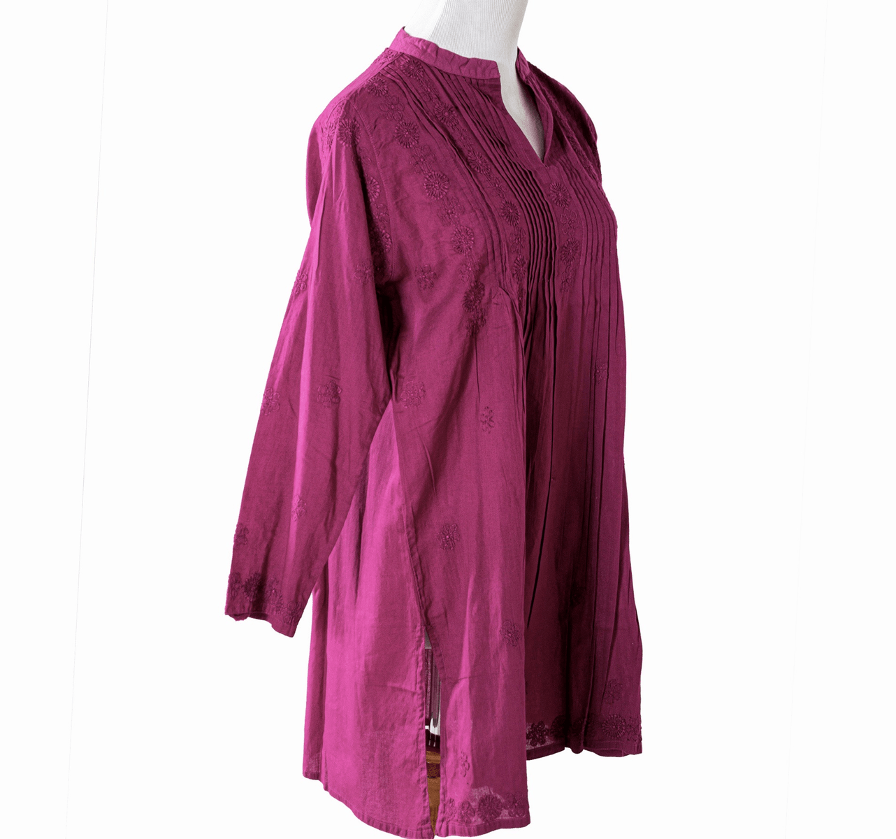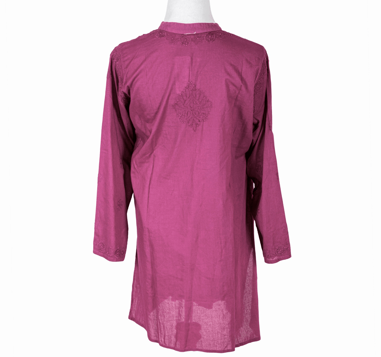 Evergreen style in comfortwear! Superior quality cotton top with front pleats and embroidery patterns. Neckline is a high collar tunic with a slit opening. It has long ¾ sleeves and side slits. Back is accented with an embroidered motif for a fully authentic look.