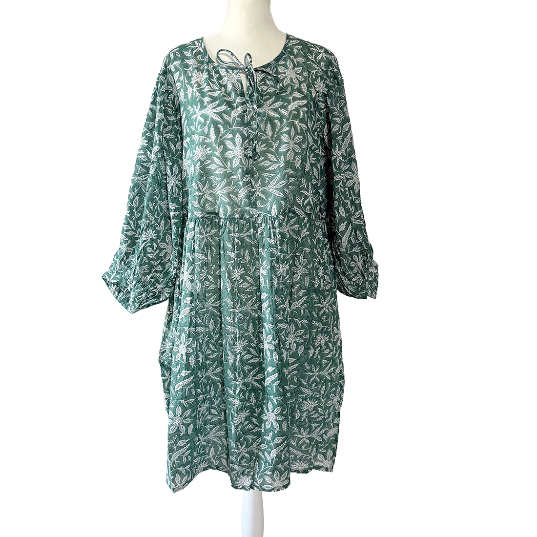 Softly romantic and effortlessly graceful, the Silver Meadow Block-Print Dress embodies timeless boho elegance. Handcrafted in airy cotton with a delicate floral block print, it drapes beautifully with a relaxed, flowy silhouette that moves with quiet charm. The tie-front neckline and gently gathered waist add a touch of femininity, while the billowed sleeves lend an artisanal, vintage-inspired finish.