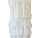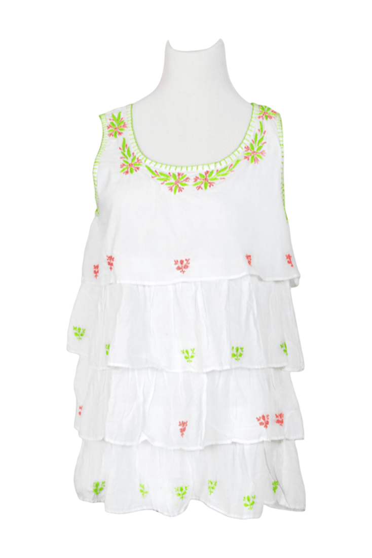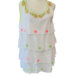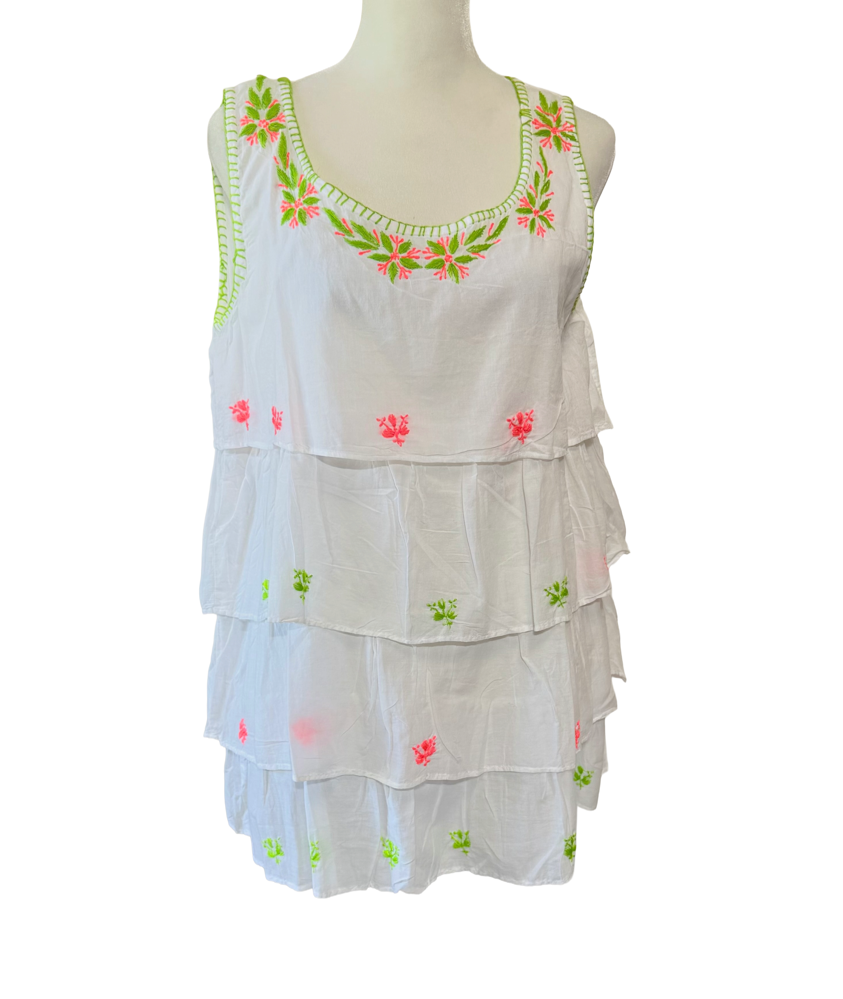 Light, airy, in breathable superior cotton, soft feeling with hand embroidery. Tiered in three layers of embroidered long ruffles with blanket stitch edging makes it a fun top to wear for all ages.