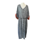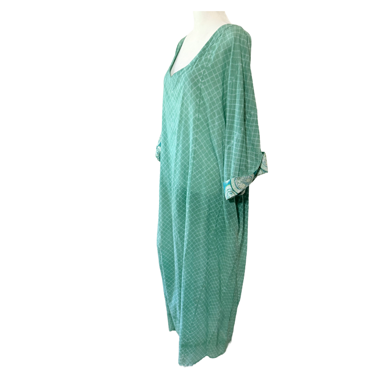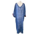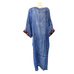 A full-length kaftan in hand block Shibori print accented with a contrast color print border on the sleeves. The front neckline is a deep V with a drawstring waistline to adjust the shape for all body types. This is a breezy cotton kaftan with side pockets! A kaftan for beach, resort, vacation, cruise, pool, home parties, and or lounge this kaftan is a step higher from casual wear to upper casual wear.
