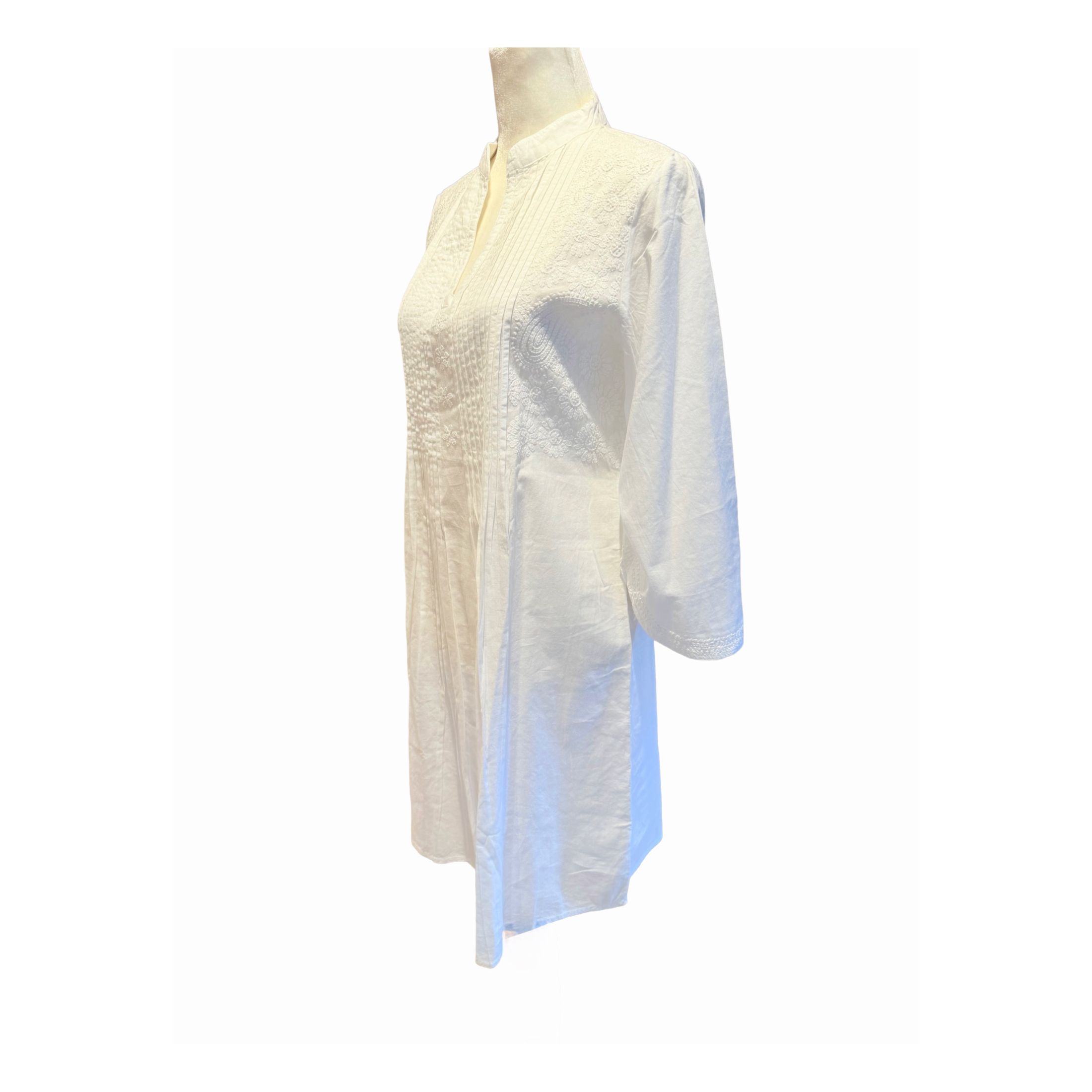 Light and airy Tunic Top in superior soft-feel cotton with hand embroidery. . High collar neck with a slit. Pleated front with embroidered sides and tulip sleeves makes it a classy style. Back is accented with a matching embroidered motif. The tunic easily slides over the head making it a versatile use as a tunic top, or an elegant swim cover-up or wear it belted as a mini.