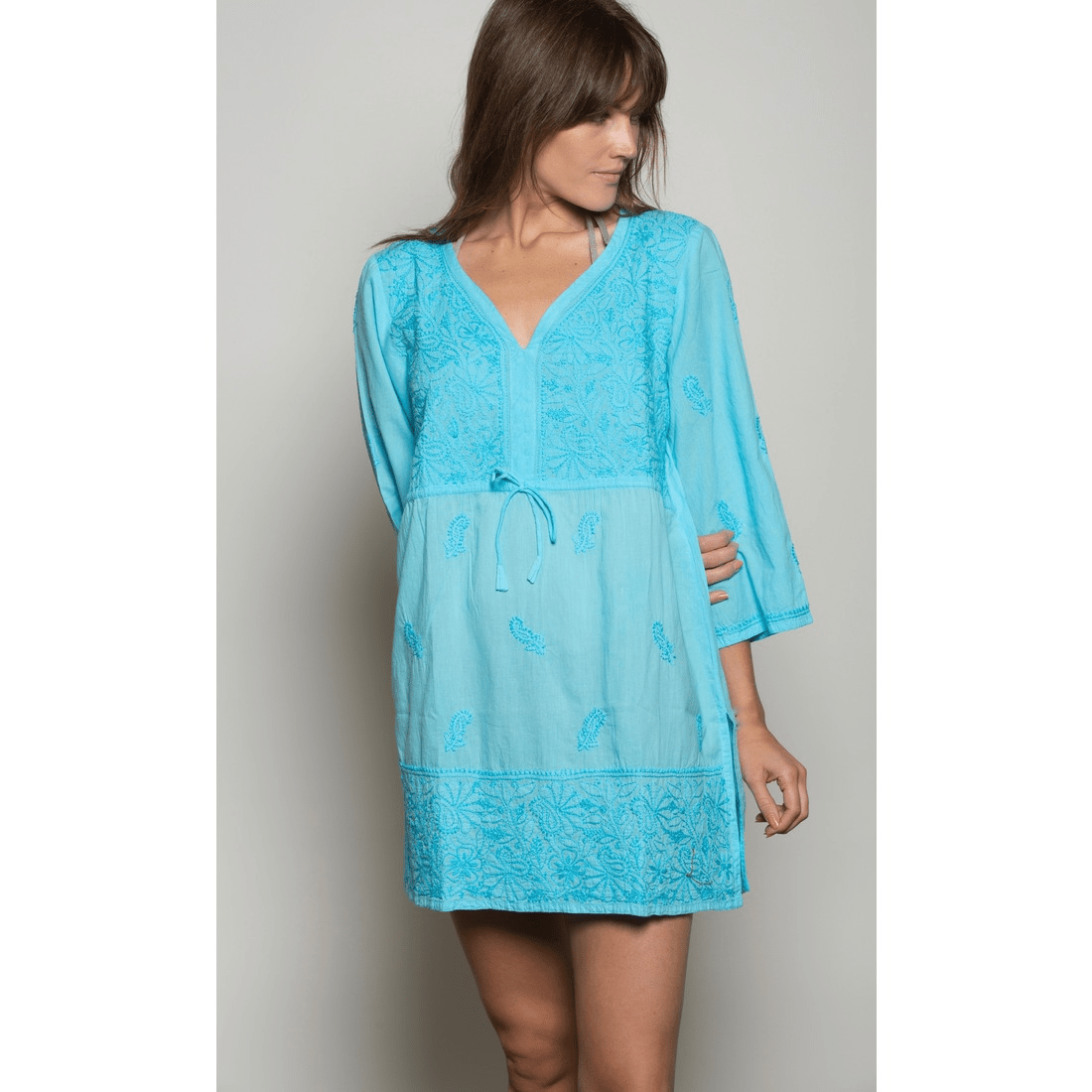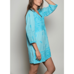 Soft, comfortable in breathable cotton with heavy embroidery on the front yoke and bottom. Addition of a drawstring for added size contour. Leave it untied for a loose-fitting. V-shape neckline. Can be worn over as a cover-up or a top.